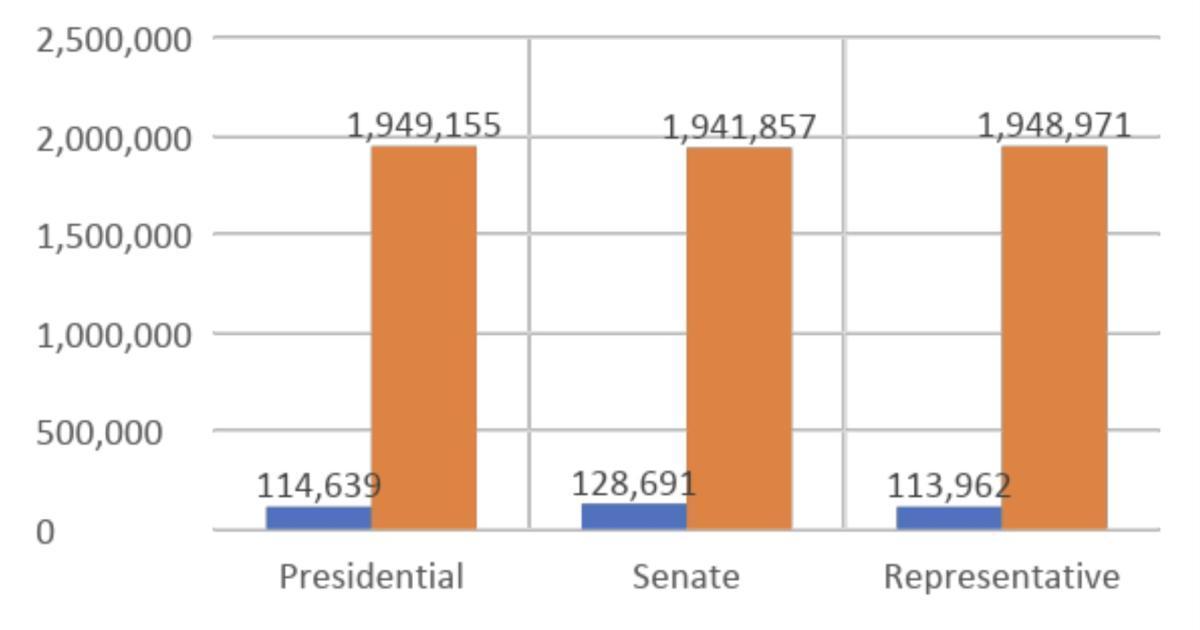 For example, the total votes cast for president is reported as 1,949,155, representing 114, 639 invalid votes and 1,834,516 valid votes. The below table includes the same relationship between the Senate and the Representative. No other category of votes out of the votes cast is captured in the NEC report.