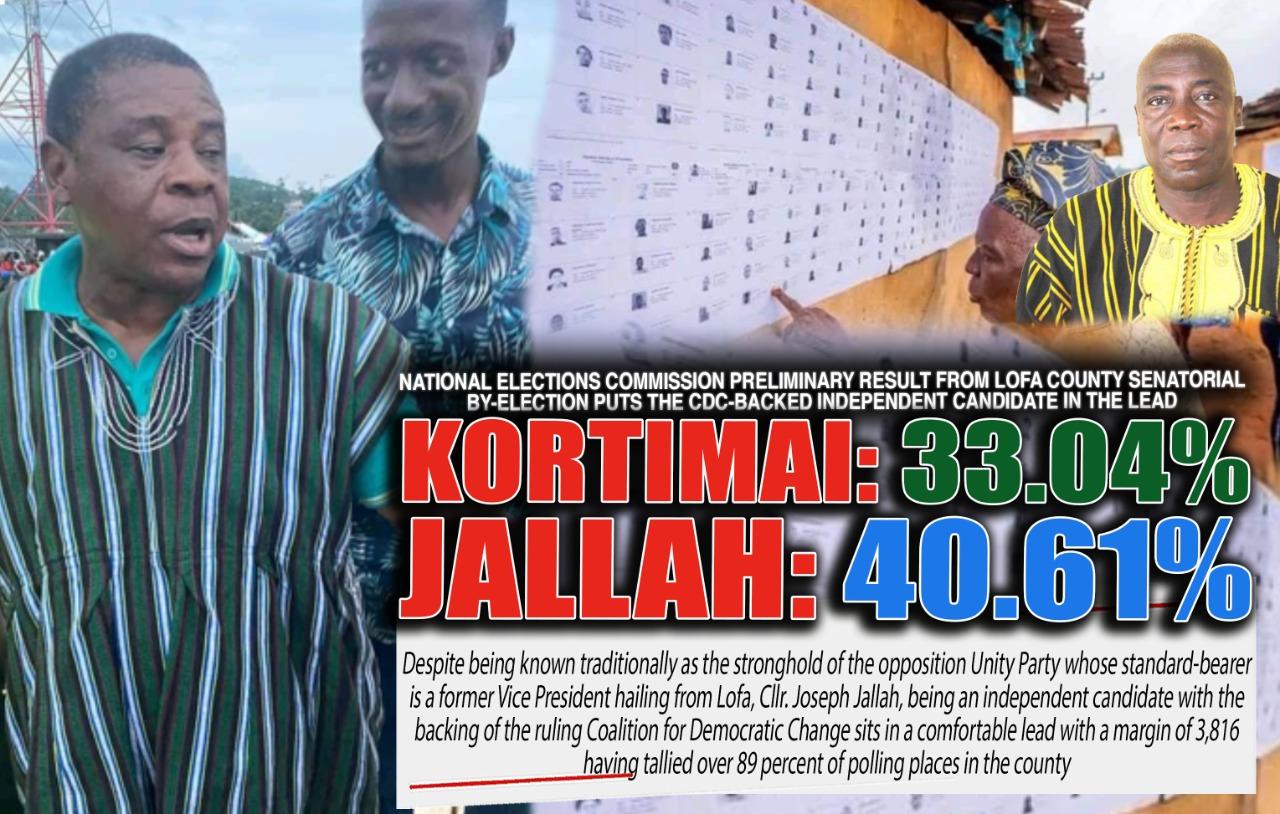The CDC-backed candidate appears to be on his way to the Capitol Building having garnered 17,362 votes at the expense of Kortimai’s 9,245 votes in lower Lofa. The total margin between Jallah and Kortimai as provided by the NEC local office is 8,117 votes.