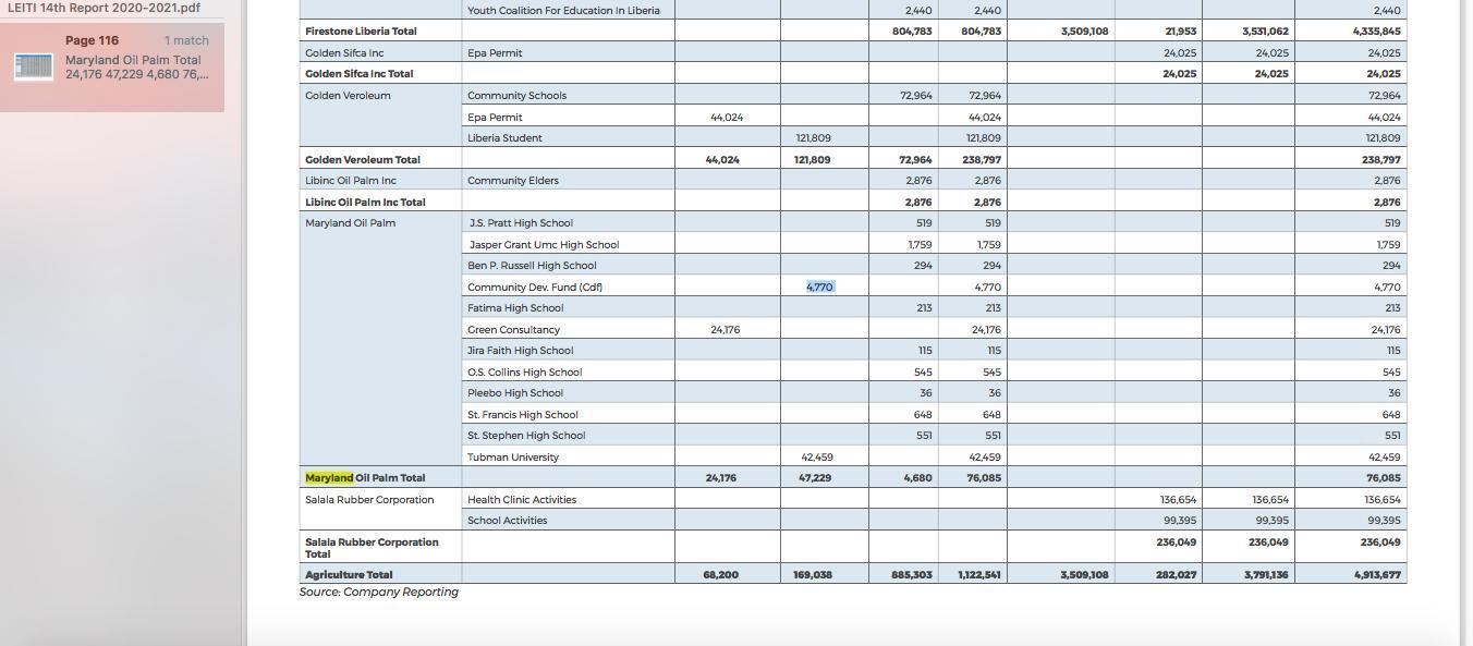 Africa-Press – Liberia. The Maryland Oil Palm Plantation (MOPP) told the Liberia Extractive Industries Transparency Initiative (LEITI) paid US$4,774 to communities affected by its project between 2020 and 2021