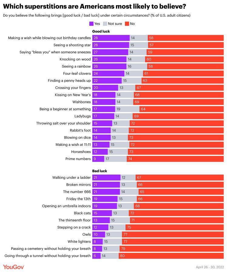 According to the results, in general, people were more prone to believe in superstitions associated with good fortune than those associated with bad luck.