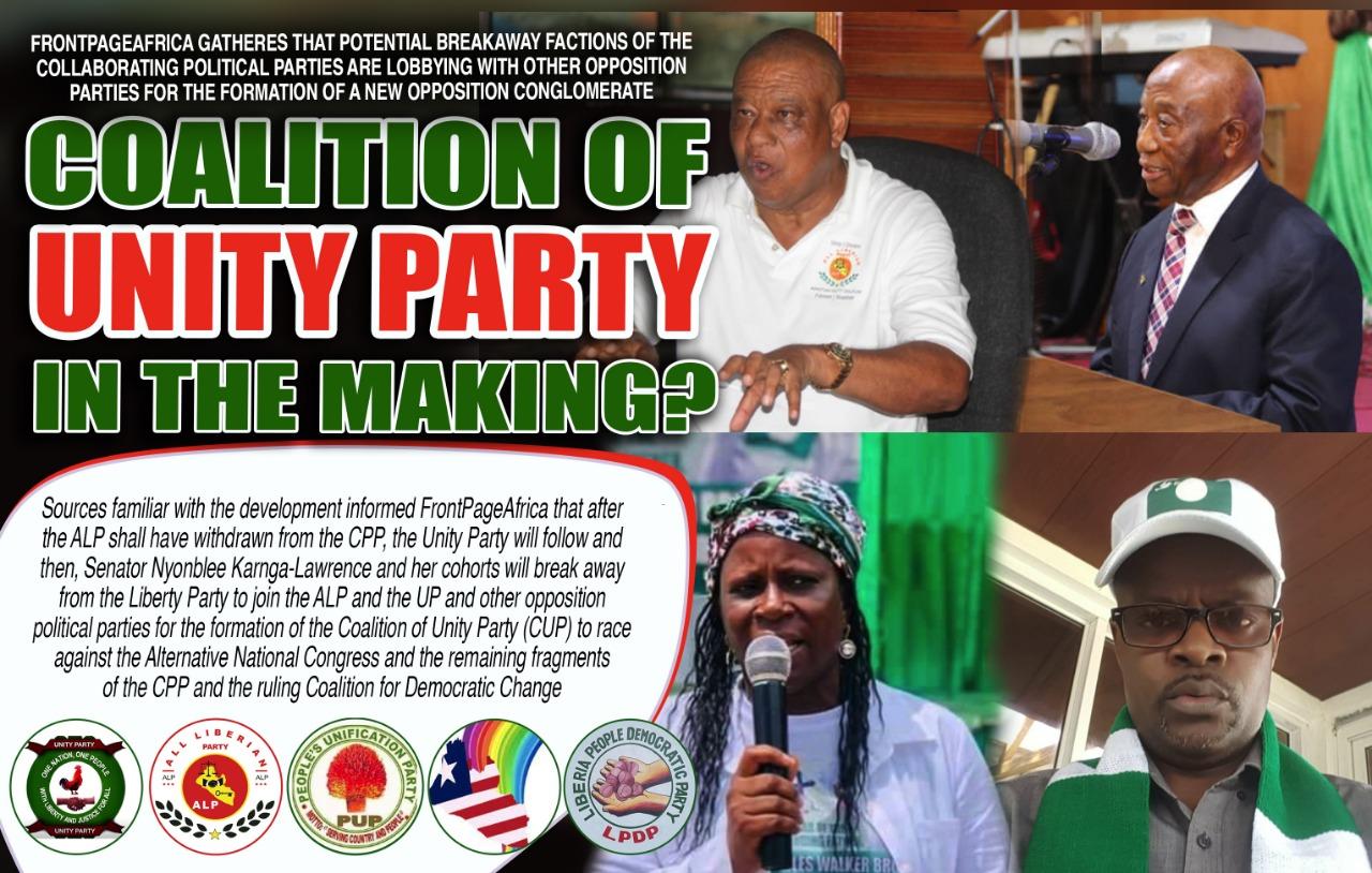 Sources familiar with the formation of the new Coalition informed FrontPageAfrica that after the ALP shall have withdrawn from the CPP, the Unity Party will follow and then, Senator Nyonblee Karnga-Lawrence and her cohorts will break away from the Liberty Party to join the ALP and the UP and other opposition political parties for the formation of the Coalition of Unity Party (CUP) to race against the Alternative National Congress and the remaining fragments of the CPP and the ruling Coalition for Democratic Change in the 2023 elections.
