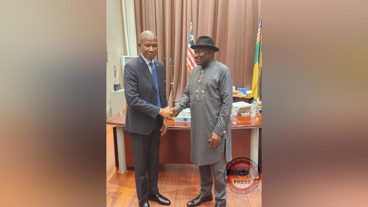Africa-Press – Liberia. The former Head of State and Government of the Federal Republic of Nigeria, H.E. Goodluck E. Jonathan along with the former Prime Minister of Burkina Faso and ECOWAS’ Commission President Kadrie Desire Ouedraogo have paid a courtesy visit to the Speaker of the 54th Legislature House of Representatives, Dr. Bhofal Chambers, discussing Liberia’s elections, ensuing for 10 October this year.