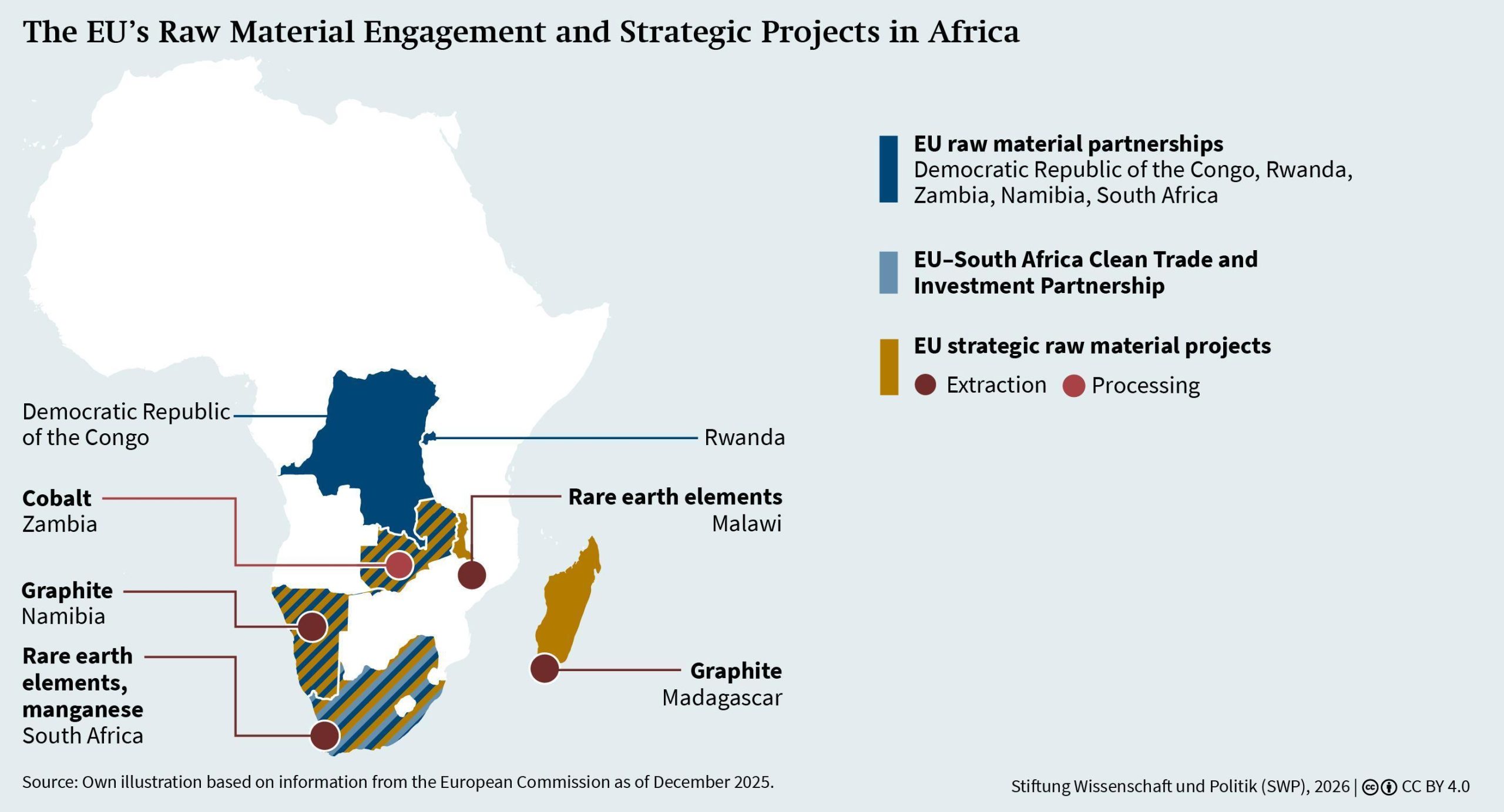 While development-oriented instruments are well suited to deliver on govern­ance, sustainability and capacity-building objectives, they are less effective in mobilis­ing CRM investment and accelerating indus­trial projects, which is what African part­ners are expecting. To help close this gap, the EU has started launching its strategic raw material projects. The first such projects were announced in 2025, including five in Africa (not all of which are partnership countries). They are intended to strengthen links between African producers and Euro­pean industry. As Figure 1 shows, they com­prise four mining projects (in Madagascar, Malawi, Namibia and South Africa) and one refining project (in Zambia) and cover five of the CRMs included in the 2024 EU’s list of 13 strategic raw materials.
