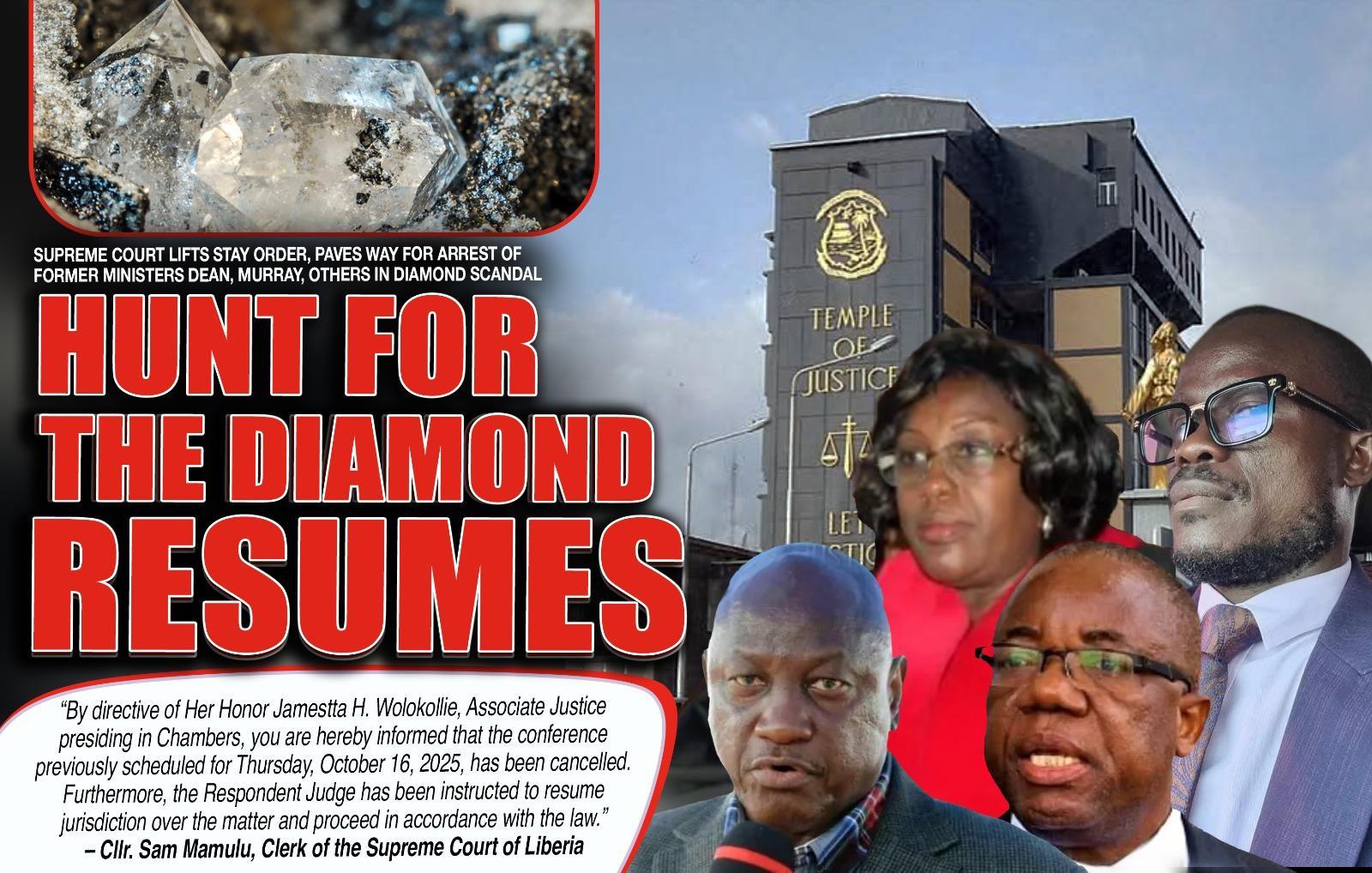 Africa-Press – Liberia. The Supreme Court of Liberia has officially lifted a stay order that had halted legal proceedings in the high-profile 53.34-carat diamond scandal, removing a major legal barrier to the arrest and prosecution of former Justice Minister Cllr. Frank Musah Dean Jr. and five others.