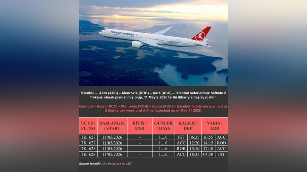 Africa-Press – Liberia. Turkish Airlines has announced plans to launch new flights connecting Istanbul and Monrovia, Liberia, with a stopover in Accra, Ghana. Starting May 11, 2026, the airline will operate two weekly flights on the route Istanbul – Accra (ACC) – Monrovia (ROB) – Accra (ACC) – Istanbul, designated as TK 627 and TK 628.