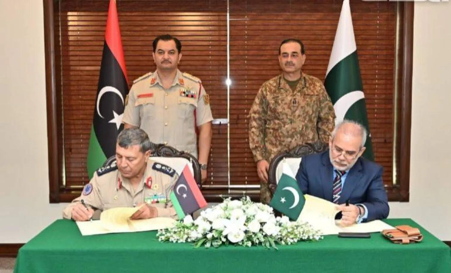 وكانت وكالة «رويترز» قد أفادت بأن الاتفاق جرى توقيعه عقب اجتماع جمع عاصم منير، قائد الجيش الباكستاني بالفريق صدام حفتر، نائب القائد العام لـ«الجيش الوطني» خلال زيارته الأخيرة إلى بنغازي، وذلك في مؤشر على تغيير محتمل في مقاربة بعض القوى لملف التسليح الليبي.
