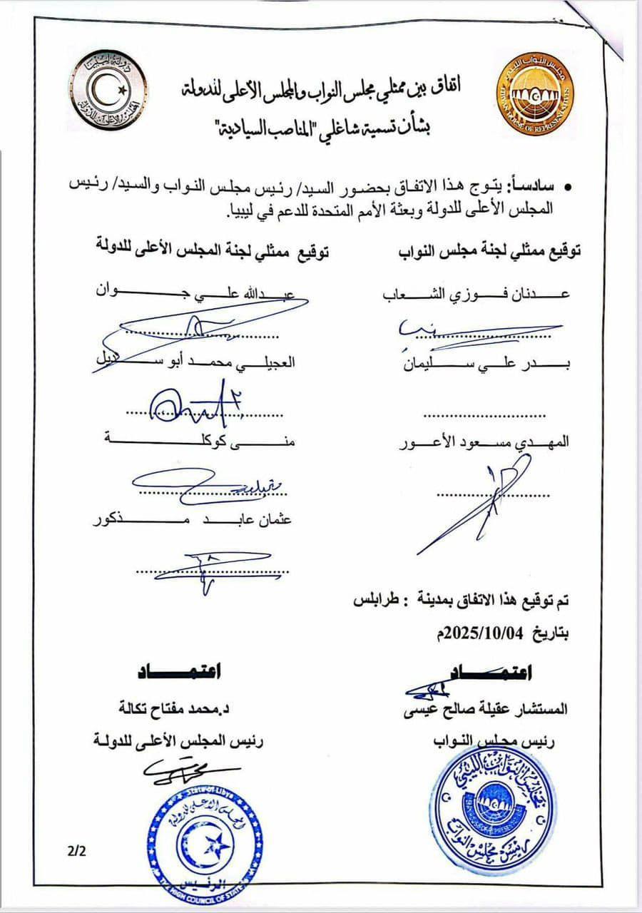 وبحسب نص الاتفاق، يتولى كل من مجلس النواب والمجلس الأعلى للدولة اختيار الأسماء المرشحة لتولي المناصب السيادية وفق معايير محددة، على أن تُحال الأسماء النهائية إلى مجلس النواب لاعتمادها رسميًا.