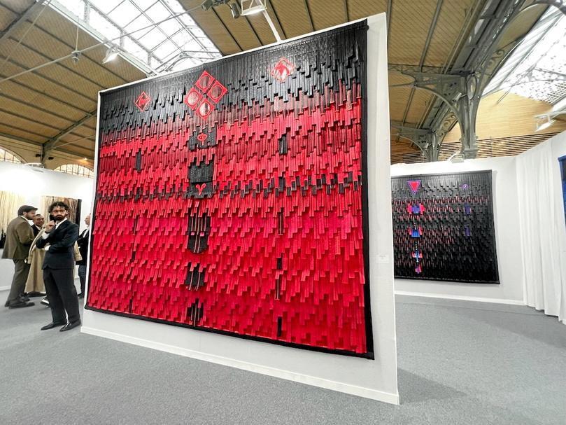 Pour la première fois à Akaa, la galerie marocaine MCC présente le travail d’Amine El Gotaibi, après une autre première, la grande installation de ce même artiste dans la grande cour du Somerset House à la foire 1-54 à Londres. « C’est pour nous, jeune galerie, une grosse visibilité. À Marrakech, dans notre espace, nous travaillons sur des expositions d’un an autour d’un artiste, avec une résidence, des conférences, des visites de curateurs internationaux. Nous organisons aussi des concerts, des vernissages, en lien avec l’univers de l’artiste », explique Fatima-Zohra Bennani Bennis fondatrice de la galerie. Artiste marocain, Amine El Gotaibi déploie de grands formats, comme Désert de laine où il mêle la laine et le cuivre, des éléments naturels que l’artiste relie à une réflexion historique et sociétale sur son pays et l’Afrique.