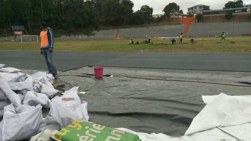 Le stade d’Alarobia commence à prendre forme. Les travailleurs pour verdoyer la pelouse s’activent en relai selon la spécialité de chacun. Les uns poussent la brouette pleine de gazon pour les déposer auprès des autres travailleurs, certains éparpillent des fertilisants, d’autres s’occupent de l’arrosage.