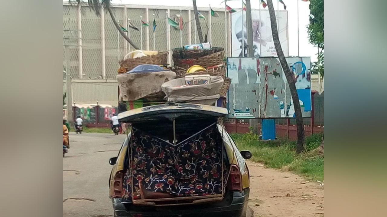 Oui, à nos yeux, il paraît assez bizarre, pour tout dire. Non pas par sa forme, elle n’a rien de particulier ; mais par son aménagement. A priori, on s’attend à ce qu’il ressemble à tous les autres taxis circulant à travers la ville. Ce qui, pour ce cas-ci, n’est pas le fait. Loin s’en faut ! En effet, sa malle arrière est grandement ouverte. Pour montrer, sans doute, que c’est fait pour durer, du moins, aussi longtemps qu’il va rouler en ville. On en a la preuve, quand on voit que son coffre est soutenu par deux tiges métalliques placées aux extrémités. Ce qui signifie qu’on veut le garder ouvert, pendant un certain temps. Avec en appui, un pagne tendu qui tient lieu de rideau pour une raison indéfinie, que nous pensons être un souci de se mettre à l’abri des regards. Tout cela nous interpelle. Et voilà que nous nous demandons : à quelle fin donc, procède -t-on ainsi, à pareil aménagement?