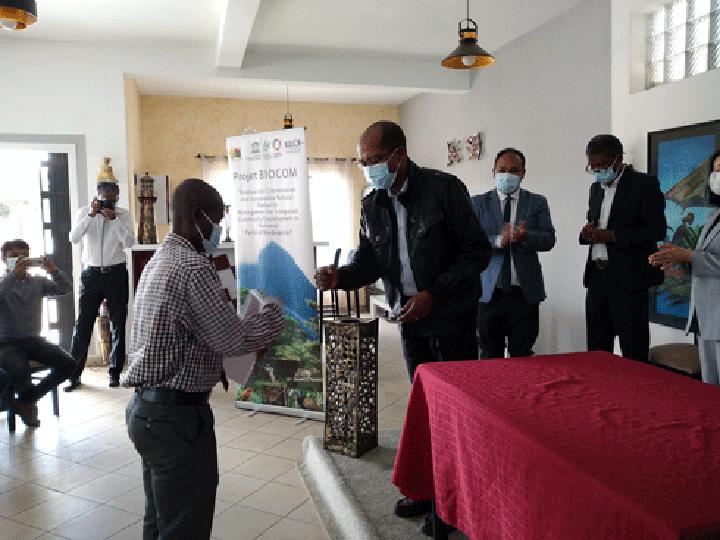 Un agent de parc recevant son certificat à Ambodiafontsy, hier.
