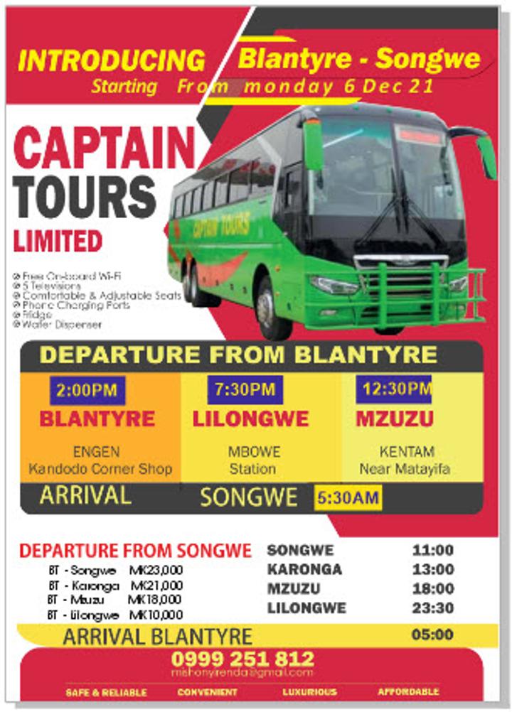 Africa-Press – Malawi. Malawi’s leading bus service company – Captain Tours – has introduced a bus service between Blantyre and Songwe Border in Karonga effectively eliminating the torture businesspersons and tourists used to endure when travelling to the Northern Port.