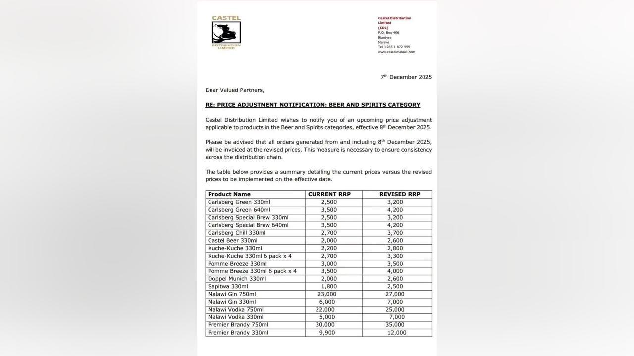 Africa-Press – Malawi. Castel Distribution Limited (CDL) has announced a fresh round of price increases on its beer and spirits products, with the new prices set to take effect from 8th December 2025, sparking concern among consumers and traders across the country.