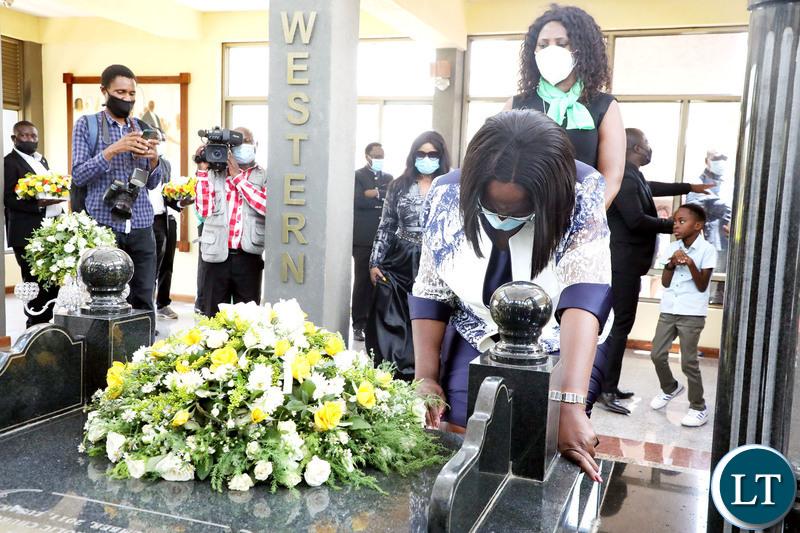 Africa-Press – Malawi. Former First Lady Dr Christine Kaseba Sata laying a wreath on her late husband’s grave during Late President Michael Sata’s memorial Mass at Embassy Park