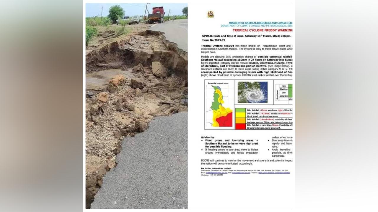 “The Ministry of Education has received expert information from the Department of Climate Change and Meteorological Services that the effects of Tropical Cyclone FREDDY being experienced in the Southern Region Districts of Nsanje, Chikwawa, Mulanje,Phalombe, Blantyre, Thyolo, Chiradzulu, Mwanza, Neno and Zomba, will intensify, with the Cyclone expecting to hit the region this evening or tomorrow 13th March, 2023; and dying down by Tuesday.