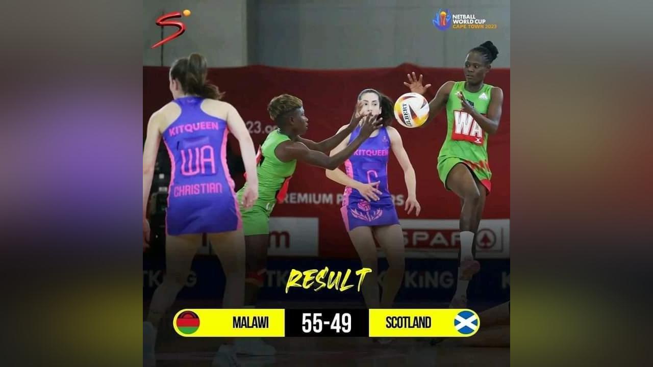 Africa-Press – Malawi. Malawi National Netball team, the Queens on Friday night, July 28, 2023, came from behind to beat Scotland 55-49 in their first Group B match of the Netball World Cup in South Africa.
