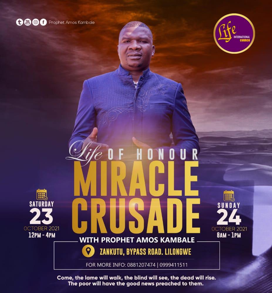 Kambale has announced a two-day Life of Honour Miracle Crusade from 23-24 October 2021 at Zamkutu Trading Centre along Bypass Road in Lilongwe during which he says he will not only heal the sick, but also raise the dead in fulfilment of the gospel of the Lord Jesus Christ.