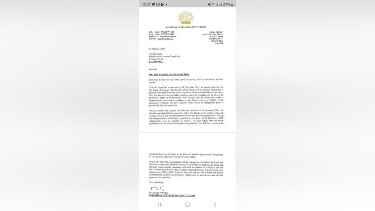 Africa-Press – Malawi. The Registrar of Financial Institutions has given trustees of the Public Service Pension Trust Fund (PSPTF) seven days to rescind the controversial acquisition of Amaryllis Hotel — or face administrative penalties for defying regulatory orders and breaching prudential limits.
