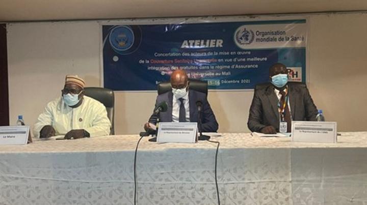 Africa-Press – Mali. L’hôtel Radisson Blu de Bamako abrite du 15 au 16 décembre 2021 l’atelier de Concertation des acteurs de la Mise en œuvre de la couverture sanitaire universelle en vue d’une meilleure intégration des gratuités dans le régime d’assurance maladie universelle au Mali. Le conseiller technique du ministère de la santé et du développement social, M Moussa Diawara a procédé le mercredi 15 décembre à l’ouverture des travaux, il avait à ses côtés le représentant du Représentant résident de l’OMS, M. Aliou Ibnou Abytalib Diouf.