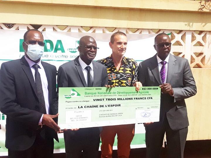 Africa-Press – Mali. Il est reconnu que la Banque nationale de développement agricole (BNDA) est une banque de solidarité et d’entraide. Elle ne cesse de magnifier ces valeurs cardinales de notre pays. Ainsi, conformément à sa politique de responsabilité sociétale, elle vole au secours des enfants malades du cœur. C’est dans ce cadre que la Banque verte a remis 23 millions F CFA à la disposition de la Chaine de l’Espoir pour la prise en charge de l’opération chirurgicale de 10 enfants atteints de maladies cardiovasculaires. La cérémonie de remise du chèque a eu lieu le jeudi 10 mars 2022 l’hôpital Mère-Enfant le Luxembourg.