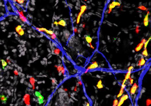 Marquage des différentes populations de mastocytes (en vert et rouge), acteurs majeurs des réponses allergiques, au contact des neurones (blanc) dans la peau de souris. © Dr Marie Tauber et Dr Lilian Basso.