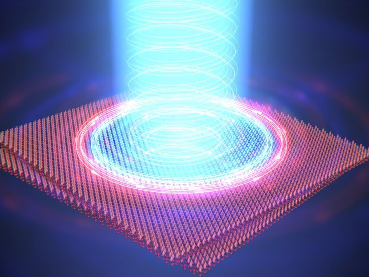 L’impulsion laser est envoyée sur du ditellurure de molybdène (MoTe2), un matériau ultrafin organisé comme un empilement de couches d’atomes, comme les pages d’un livre. Deux étages atomiques de ce composé chimique sont déposés sur un wafer. Ce dernier, d’une taille de quelques micromètres (un millionième de mètres), désigne une tranche d’un matériau semi-conducteur comme le silicium. Le tellurure de molybdène a la particularité de former des états topologiques, c’est-à-dire des configurations géométriques au niveau quantique, dictées par les électrons. De tels états peuvent être assimilés à des analogies géométriques (comme des anneaux), même si ces formes ne sont pas à prendre au sens littéral.