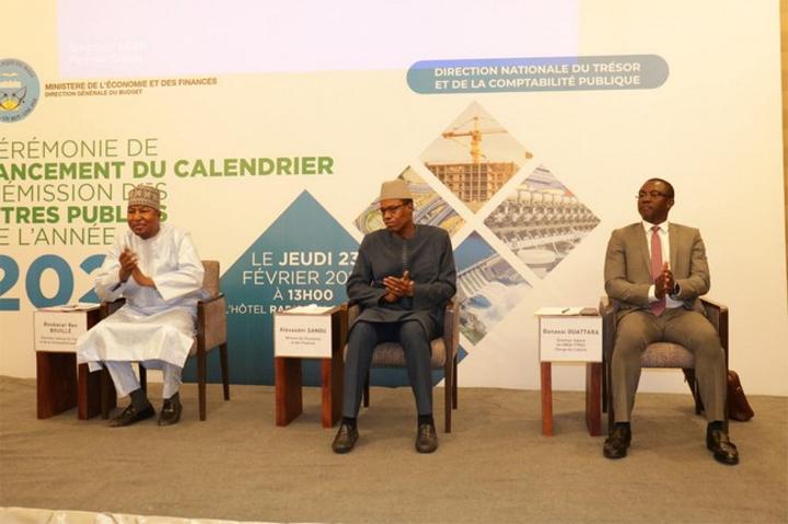 Africa-Press – Mali. Le ministre de l’Economie et des Finances, Alousseni Sanou, a procédé le jeudi 23 février 2023 au lancement du calendrier d’émission des titres publics 2023 à l’hôtel Radisson. Les émissions de titres publics (Bons et Obligations du Trésor) visent à mobiliser des ressources en vue d’assurer la couverture des besoins ponctuels de trésorerie de l’Etat et à financer des investissements nécessaires à la croissance et au développement économiques. Au titre de 2023, le montant total des titres à émettre s’élève à 1 409 milliards F CFA dont 50 milliards de bons infra-annuels.