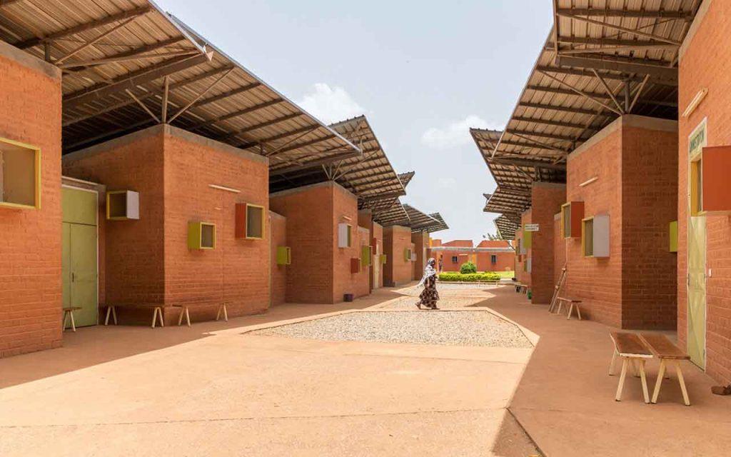 Les murs de la clinique sont faits d’une double épaisseur de briques de terre compressée et de blocs de béton pour maintenir au maximum la fraîcheur. On retrouve également de nombreux toits débordants, apportant l’ombre si précieuse dans ces environnements aux températures caniculaires et un système de recueil de l’eau de pluie pour l’irrigation des plantations environnantes, dans une région où il ne pleut que trois mois par an.