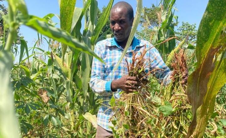 Les haricots sont plantés aux côtés du maïs et du manioc – la subsistance de cette famille de 14 personnes.
