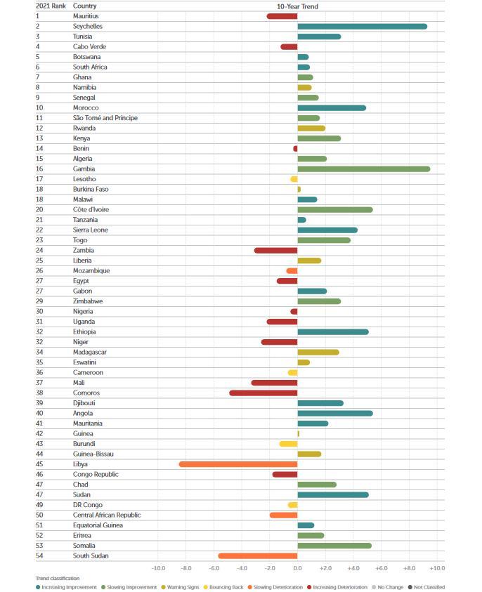 Dans le nouveau classement, l’île Maurice reste le pays africain le mieux gouverné, mais est désormais suivie des Seychelles et de la Tunisie. Les pays les moins performants du continent sont le Soudan du Sud (54e), la Somalie (53e) et l’Erythrée (52e).