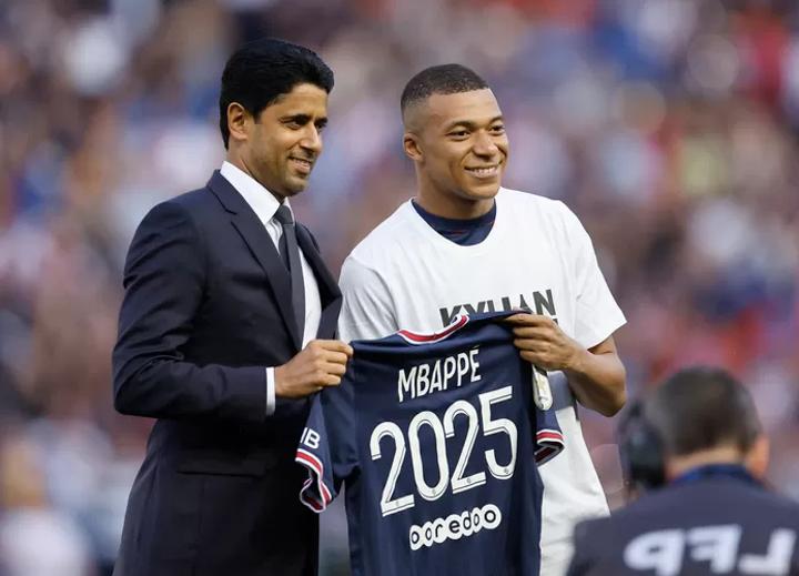 Le président du Paris SG Nasser Al-Khelaïfi a annoncé samedi devant le public du Parc des princes, euphorique, la prolongation jusqu’en 2025 du contrat de sa superstar Kylian Mbappé, présent à ses côtés sur une estrade posée sur la pelouse pour l’occasion (suite en-dessous).