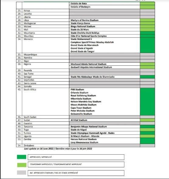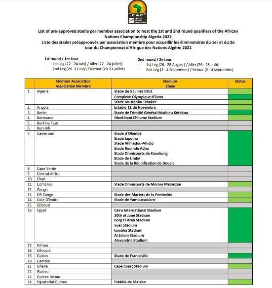 La liste des stades homologués par la CAF pour les éliminatoires du CHAN 2022