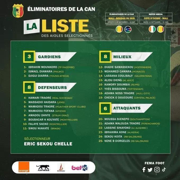 Africa-Press – Mali. Eric Chelle, le sélectionneur de l’équipe nationale du Mali, a levé le voile sur la liste tant attendue pour les prochains défis des Aigles. Le Mali affrontera la Côte d’Ivoire dans un match amical de prestige le 12, précédé d’un duel sans enjeu contre le Soudan du Sud le 8 septembre, dans le cadre des éliminatoires de la CAN 2024. >>Eliminatoires CAN 2024: tous les résultats et classements