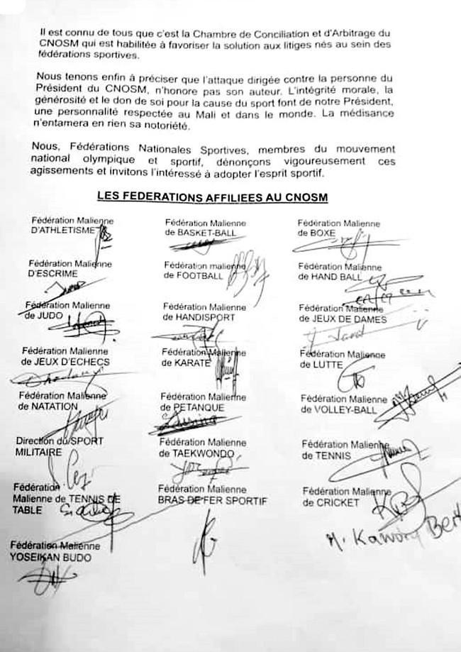 Il y a d’autres maintenant qui le font. On ne peut pas douter de la transparence du Président Habib Sissoko et de son équipe. Nous avons fait ce document pour témoigner du soutien et de la confiance de toutes les fédérations. Monsieur le Chef de cabinet, nous vous demandons de transmettre ce document au Président du CNOSM au nom de toutes les fédérations sportives du Mali”.