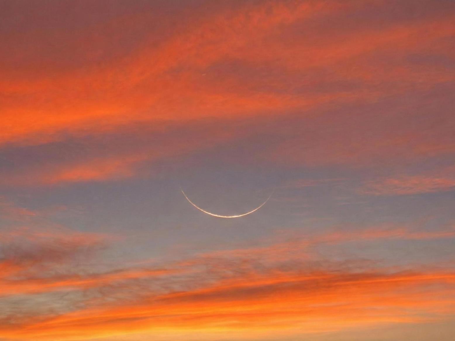 يظهر الهلال في صورتها كابتسامة كونية نحيلة جدا، يطفو وسط بحر من الغيوم المصبوغة بألوان الشفق المتفجرة بين الأحمر القاني والبرتقالي المحترق.