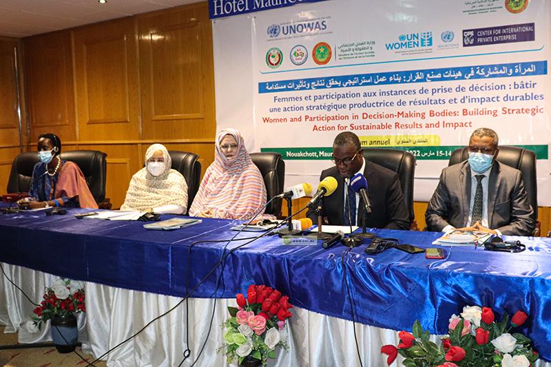 وفيما يتعلق بولوج المرأة لمراكز صنع القرار أوضح الأمين العام أن وضعيتها أصبحت أفضل من ذي قبل بفضل إرادة رئيس الجمهورية محمد ولد الشيخ الغزواني، وتوجيهاته المستمرة، فهي تمثل 20% من أعضاء الحكومة و20% من عدد أعضاء البرلمان، و7 عمد من بينهن عمدا في الوسط الريفي وهو ما يمثل تغييرا محمودا في العقليات، ورئيسة لمجلسين جهويين من بينهم المجلس الجهوي لنواكشوط، بالإضافة إلى حدود 35% من المستشارين البلديين والجهويين.
