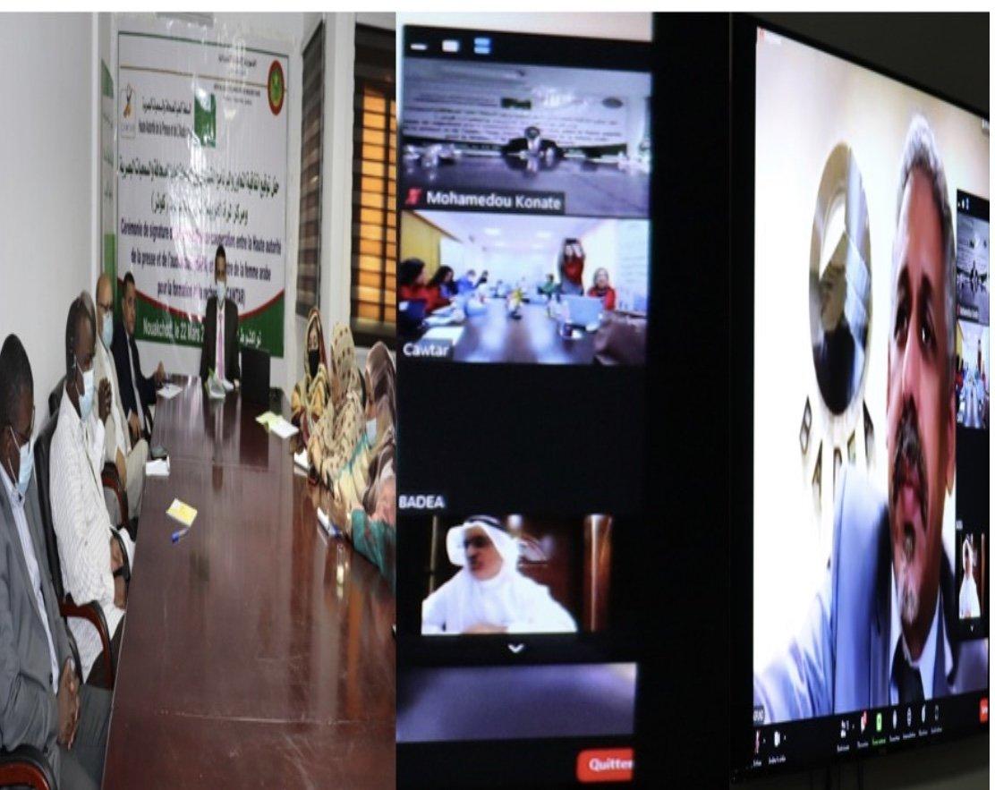 أفريقيا برس – موريتانيا. وقع رئيس السلطة العليا للصحافة والسمعيات البصرية الهابا الحسين ولد مدو اليوم الثلاثاء عبر تقنية الفيديو كونفيرانس إلى جانب د. سكينة بوراوي المديرة التنفيذية لمركز كوثر اتفاقية تعاون وبرنامج تنفيذي بين السلطة العليا ومركز المرأة العربية للتدريب والبحوث كوثر .