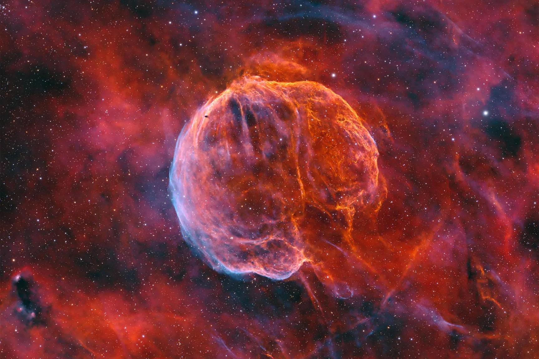 الصورة، التي التُقطت على مدى أكثر من 50 ساعة من الرصد المتواصل، تُظهر بقايا المستعر الأعظم المعروف علميا باسم “سي تي بي1” (CTB 1)، والمُلقب بسديم النخاع (Medulla Nebula) أو سديم الثوم (The Garlic Nebula)، بسبب شكله الذي يشبه في آن واحد فصوص الدماغ أو رأس الثوم.