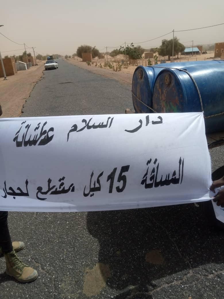 المحتجون نظموا الوقفة على الطريق الرابط بين قريتهم ومدينة مكطع لحجار، واستخدموا البراميل الفارغة للتعبير عن “معاناتهم مع العطش”.