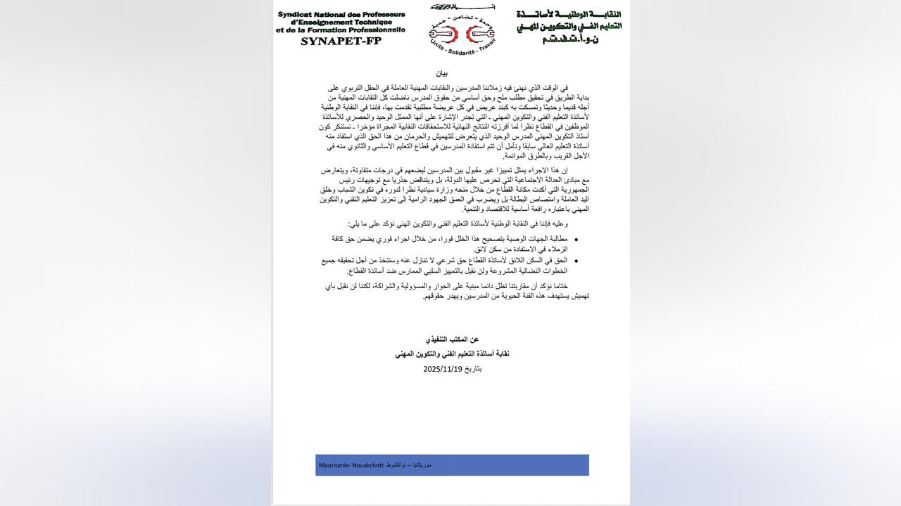 وقالت النقابة، التي تعد الممثل الحصري لأساتذة القطاع وفق نتائج الانتخابات النقابية الأخيرة، إن هذا الوضع يتعارض مع مبادئ العدالة الاجتماعية، ويتناقض مع التوجيهات العليا الداعمة للتعليم التقني والتكوين المهني ودوره في تأهيل الشباب وامتصاص البطالة، مؤكدة أن أساتذة التعليم العالي سبق أن استفادوا من هذا الحق، ومتطلعة إلى استفادة مدرسي التعليم الأساسي والثانوي منه قريباً.