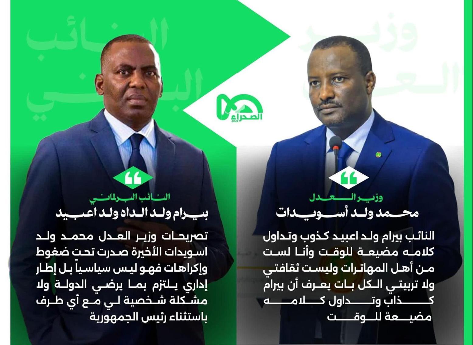 أفريقيا برس – موريتانيا. شهدت الساعات الأخيرة تداول تصريحات حملت اتهامات وعبارات قدح “قوية” بين وزير العدل محمد ولد أسويدات والنائب البرلماني بيرام ولد الداه ولد أعبيد.