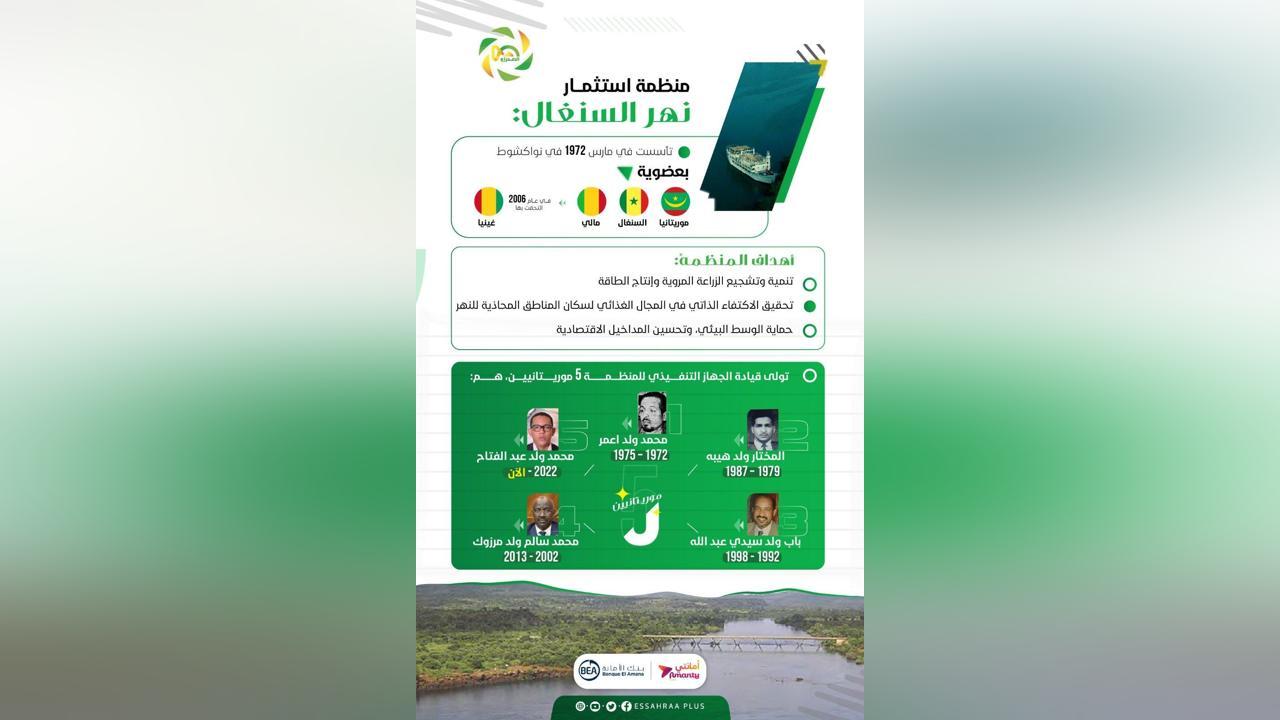 أفريقيا برس – موريتانيا. تولى الرئيس محمد ولد الشيخ الغزواني، الثلاثاء، الرئاسة الدورية لمنظمة استثمار نهر السنغال التي تعد موريتانيا عضوا مؤسسا لها. وعلى مدى أكثر من خمسين عاما تولى موريتانيون مناصب عليا في المنظمة التي تضع على رأس أولوياتها تحقيق الاكتفاء الذاتي في المجال الغذائي في المجال الغذائي لسكان المناطق المحاذية للنهر. الأنفو غراف المرفق يعرفنا على الموريتانيين الذين تولوا قيادة الجهاز التنفيذي للمنظمة.