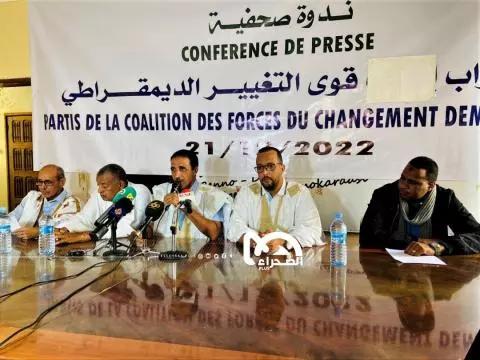 وفي ضوء هذه الوضعية العامة، وخصائصها البارزة، وحقيقية القوى الموجودة، وانطلاقا من المصالح الأساسية لبلادنا، فإننا نحن، أحزاب ائتلاف قوى التغيير الديمقراطي، بناءً على قناعتنا الراسخة أنه بدون إصلاحات تصب في مصلحة المواطن والبلد لا وجود للاستقرار، وبدون استقرار لا وجود لإصلاحات محتملة، وبدون حملة هادئة لا وجود لنتائج انتخابية مقبولة، نوجه نداءً إلى الشعب الموريتاني، وعلى وجه الخصوص إلى جميع القوى السياسية الوطنية من كافة المشارب، للعمل على استباق التهديدات التي تواجه بلادنا من خلال تجاوز خلافاتنا وتناقضاتنا الثانوية، ورص الصفوف والسير على الطريق الصحيح لتحقيق توافق وطني، مهما كان شكله، هو الوحيد الذي سيمكننا من تفادي الأخطار التي تتهددنا؛ إن الأوضاع العامة تتطلب منّا وضوح الرؤية والجرأة، للمُضي قدما في الانسجام، والوحدة الوطنية والتماسك الاجتماعي، والديمقراطية.