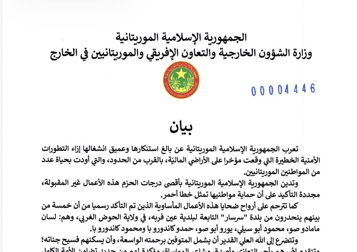 وأعربت الخارجية، في بيان صادر فجر اليوم السبت، عن بالغ استنكارها وعميق انشغالها إزاء التطورات الأمنية الخطيرة التي شهدتها الأراضي المالية بالقرب من الحدود، والتي أودت بحياة عدد من المواطنين الموريتانيين.