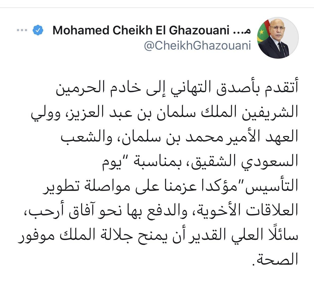 جاء ذلك في تغريدة له قبل قليل تقدم فيها “بأصدق التهاني إلى خادم الحرمين الشريفين الملك سلمان بن عبد العزيز، وولي العهد الأمير محمد بن سلمان، والشعب السعودي الشقيق، بمناسبة “يوم التأسيس”