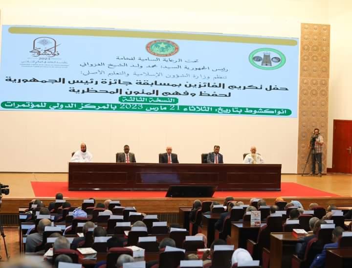 وسلم الرئيس غزواني الجائزة الأولى والتي تبلغ تبلغ 5.000.000 أوقية قديمة، للفائز بالمركز الأول أحمد محمد الأمين باب، كما سلم الوزير الأول محمد ولد بلال الجائزة الثانية التي تبلغ 4.000.000 أوقية قديمة لعبد السلام محمد محمود سعيد الذي حل في المرتبة الثانية. فيما وزير الشؤون الإسلامية الداه ولد سيدي ولد أعمر طالب الجائزة الثالثة والبالغة 3.000.000 أوقية قديمة لعبد الرحمن محمدن موسى الذي حل في المرتبة الثالثة.