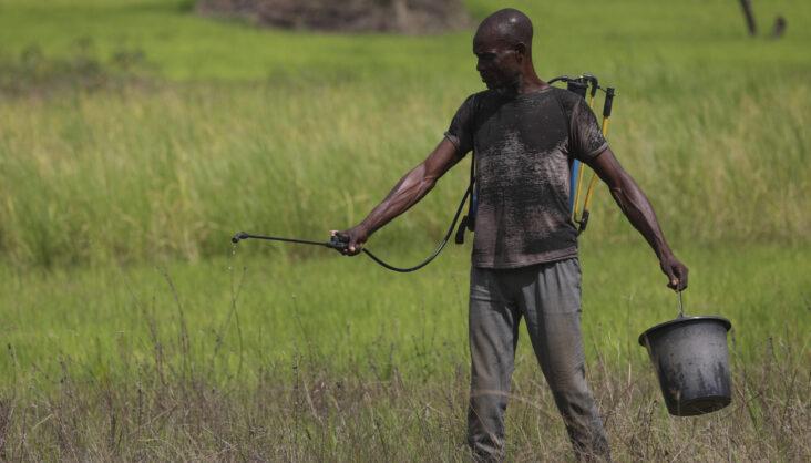 Godwin Teremun, a rice farmer, fumigates his farm after relocating from his large rice farm to a smaller one in Otukpo, Benue State, Nigeria, on August 11, 2021. (Photo by Kola Sulaimon / AFP)