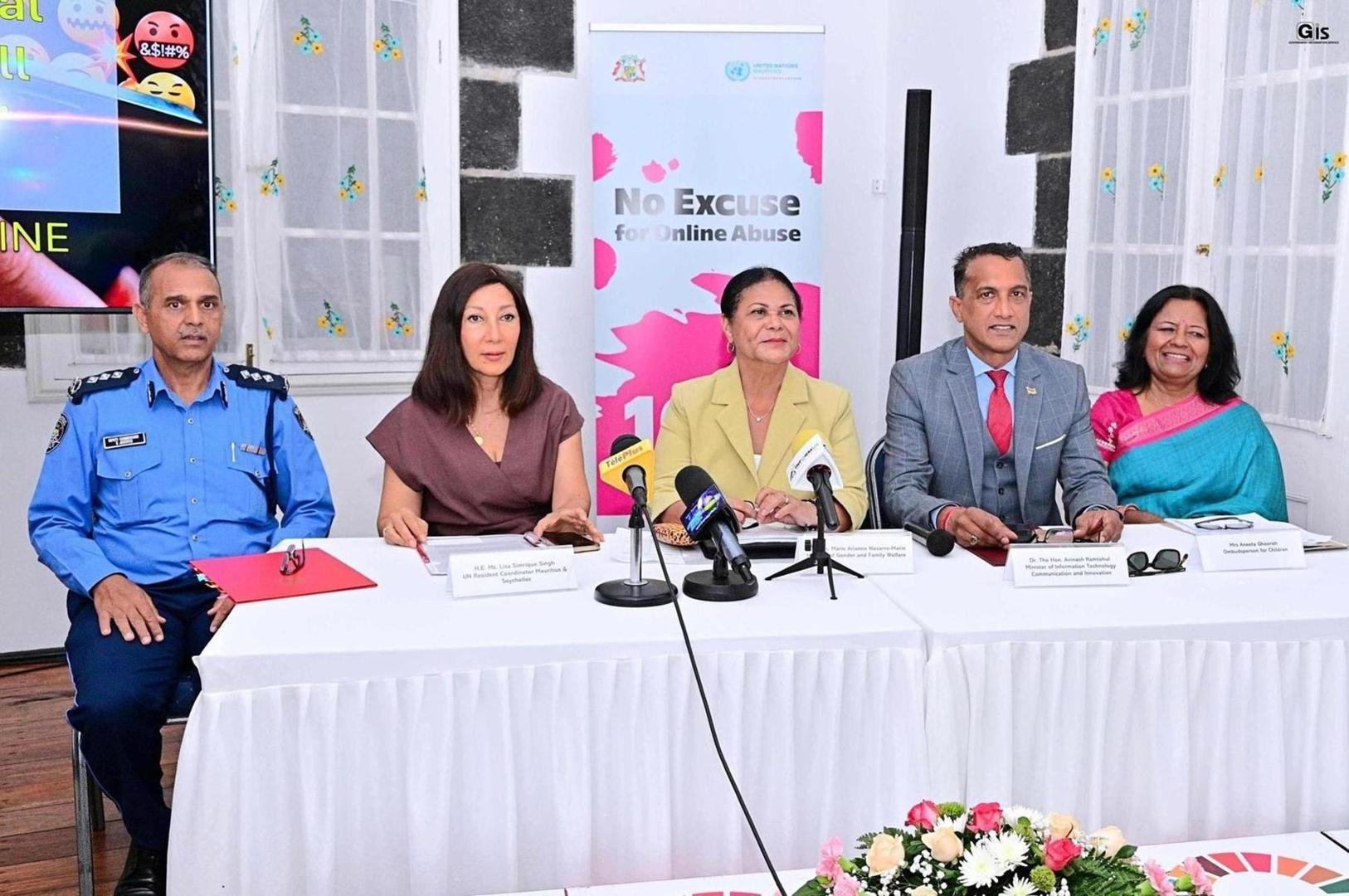 The campaign, starting from 25 November 2025 and running till 10 December 2025, was unveiled by the Minister of Gender Equality and Family Welfare, Mrs Marie Arianne Navarre-Marie, at a joint press conference with the Minister of Information Technology, Communication and Innovation, Dr Avinash Ramtohul, today in Port-Louis. The Commissioner of Police, Mr Rampersad Sooroojebally; the Ombudsperson for Children, Mrs Aneeta Ghoorah; and the United Nations Resident Coordinator in Mauritius and Seychelles, Ms Lisa Simrique Singh, were also present.