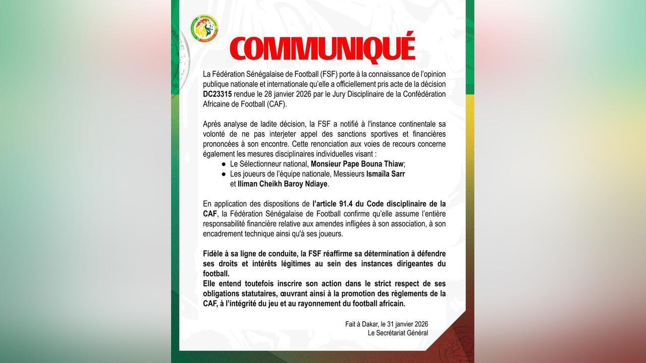 The statement, signed by the FSF General Secretariat, was issued in Dakar on January 31, 2026, signaling the federation’s intention to move forward while maintaining institutional discipline and respect for CAF’s regulatory framework.