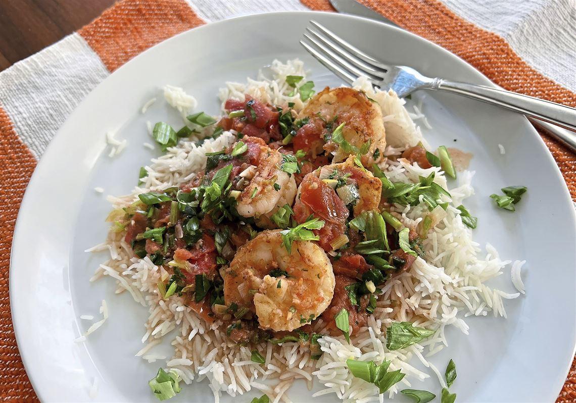 It’s served with even more cilantro — you have to be a fan — and a sprinkle of green scallions. The recipe calls for extra-large shrimp, but I used colossal (15 per pound) because it was on sale. For more bite, season the shrimp with a little more cayenne, or add a pinch or two to the tomato sauce. Serve with steamed white rice.